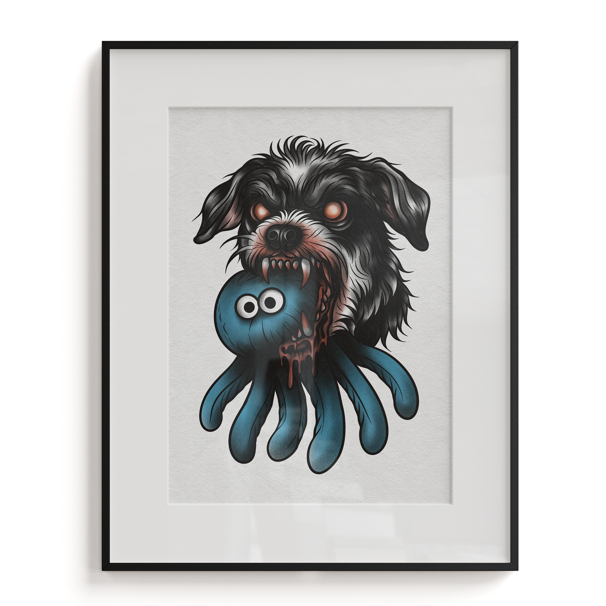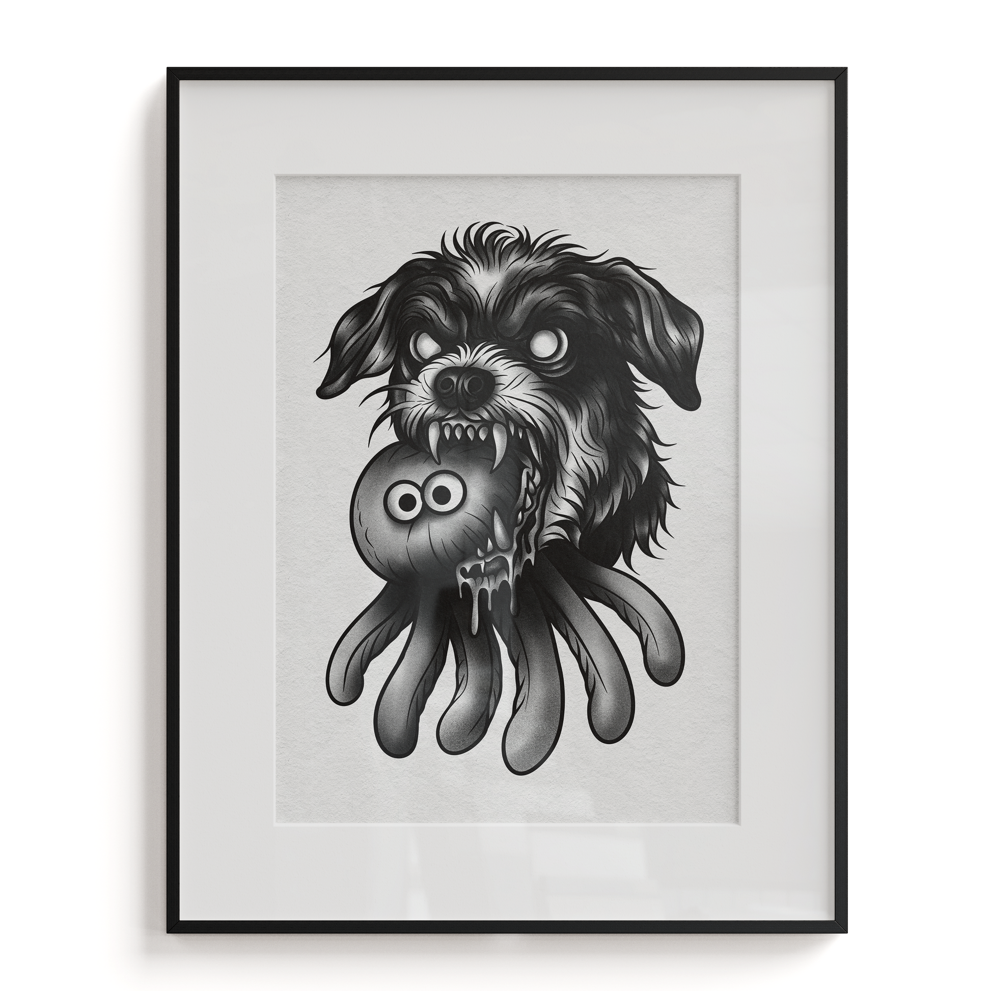 These custom pet portrait prints take your furry friend and reimagine them through the lens of bold traditional tattoo flash. Fanged, snarling, dripping with inked attitude—each piece blends classic tattoo styling with a touch of dark humour (and a lot of love). Think bloodshot eyes, chew toys, and demon energy with perfect linework.